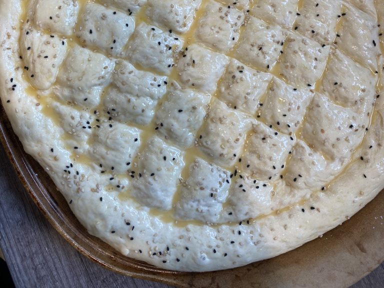 - Anschließend mit den Händen das typische Fladenbrot-Muster in den Teig drücken, das Ei verquirlen, den Teig damit bestreichen und Sesam darüber verteilen.