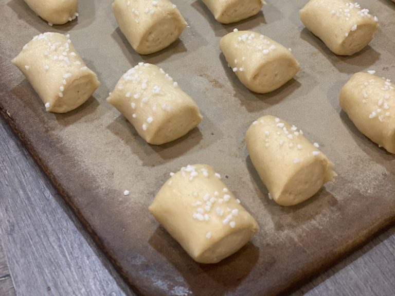 - Jeden Teigstrang für ca. 30 Sekunden von jeder Seite im Natronwasser baden.